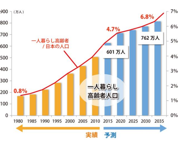 上圖是日本獨居老人的數量以及未來預測,2035年會達到762萬人之多!是總人口的6.8%。這些獨居老人多是與家人分住,有的是失去老伴、有的是無兒無女亦或者是與孩子多年沒有聯繫,這樣的情況真的很多。我認識的日本人當中,就有一個許多年沒有跟自己父母聯繫的日本人,今年已經40多歲了,他的父母也已經離婚,各自有各自的生活。如果他母親或者父親去世,雖然他能夠繼承遺產,但是他現在還沒有結婚,他的遺產,就很大可能無人繼承。