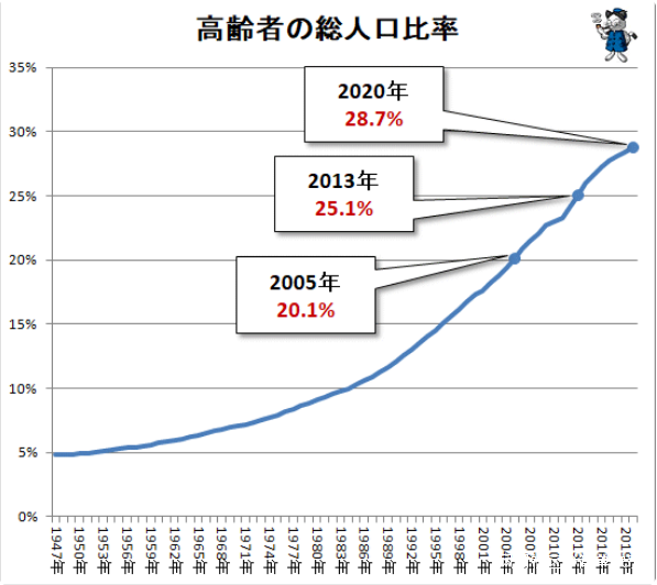 上圖是日本從1947年開始老齡人口的變遷,每年都是上升的趨勢,2005年的時候,日本老人佔據總人口的比例就達到了20.1%,2020年達到了28.7%,馬上逼近30%。特別是近年,增長速度很快。5%增長到10%用了大約20年;10%到15用了大約12年;15%到20%用了大約10年!速度每年都在增加。