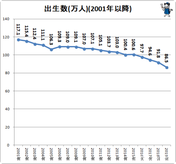 這組數據是日本每年的出生人數的統計,2001年還保持在每年100萬人以上,而2016年跌破了100萬人,只有97.7萬人;2019年更是隻有86.5萬人出生。這個出生數量,甚至都沒有日本每年死去的人多。
