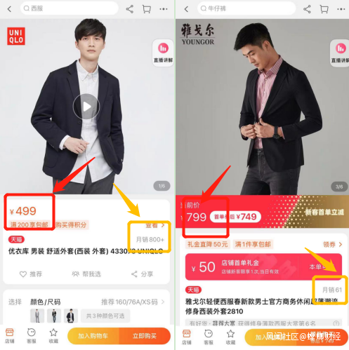 舉個簡單的例子。以下是“螳螂財經”在優衣庫和雅戈爾的天貓旗艦店找到的基礎款黑色西裝,可以看到雅戈爾從價位上高出優衣庫300元,與之相對的,銷量就並不可觀。優衣庫月銷800+,雅戈爾不過60+。