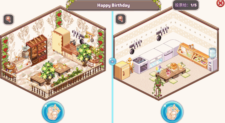 又有個主題是“開美甲店”,左邊的看起來很可愛,右邊的看起來很華麗,不過左邊的有點像咱們大街上經常見的修腳店,減了些印象分,手談姬決定投右邊。