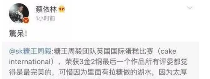 痴迷翻糖蛋糕的蔡依林,為周毅點贊。