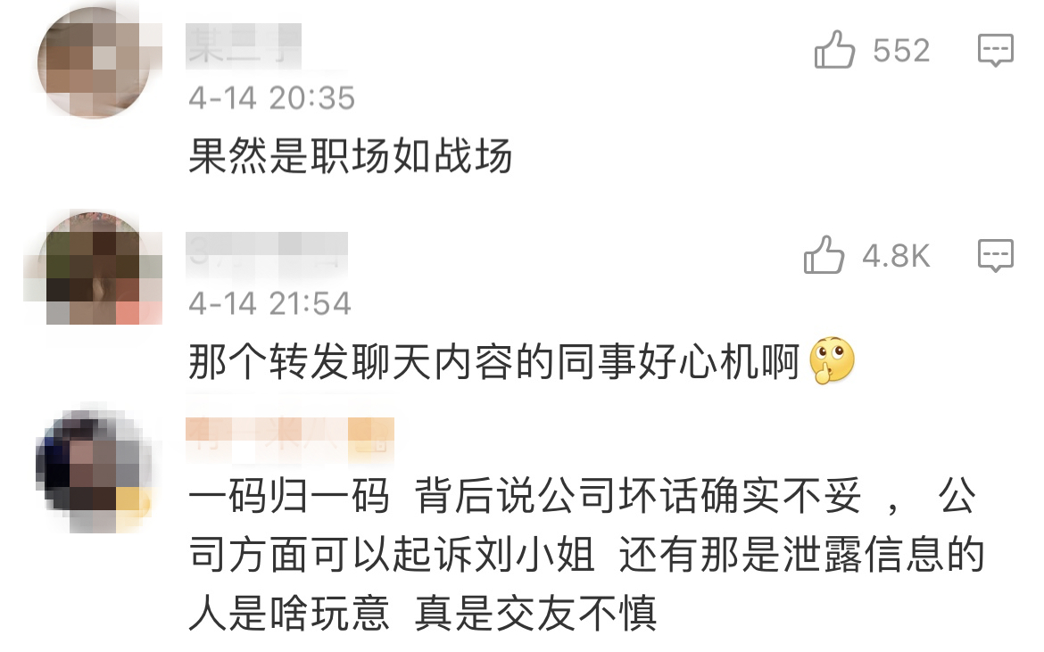 不料,羣裏一成員將聊天內容轉發給了其他同事。