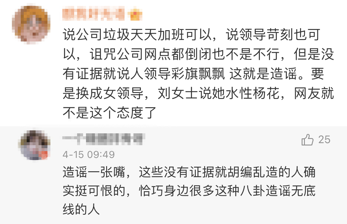 因為不滿領導長期安排加班,劉小姐和同事們會在羣裏抱怨公司、調侃領導私生活,劉小姐曾發佈了諸如“網點全部倒閉吧”“彩旗飄飄”“麻蛋的神經病”之類的言語。