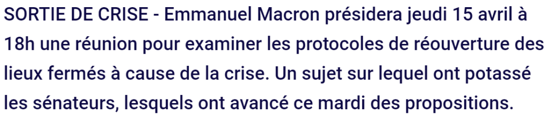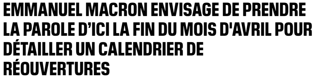 不過週四跟其他高層開會商討解封事宜是定好了的,根據BFMTV的可靠消息來源:總統伊曼紐爾·馬克龍(Emmanuel Macron)計劃在4月底發表講話,以詳細説明重新開放的時間表。