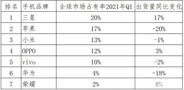 再看2021年度第一季度全球智能手機品牌的銷量數據,華為出貨量同比大跌18%,從全球第二直接掉到了全球第六。