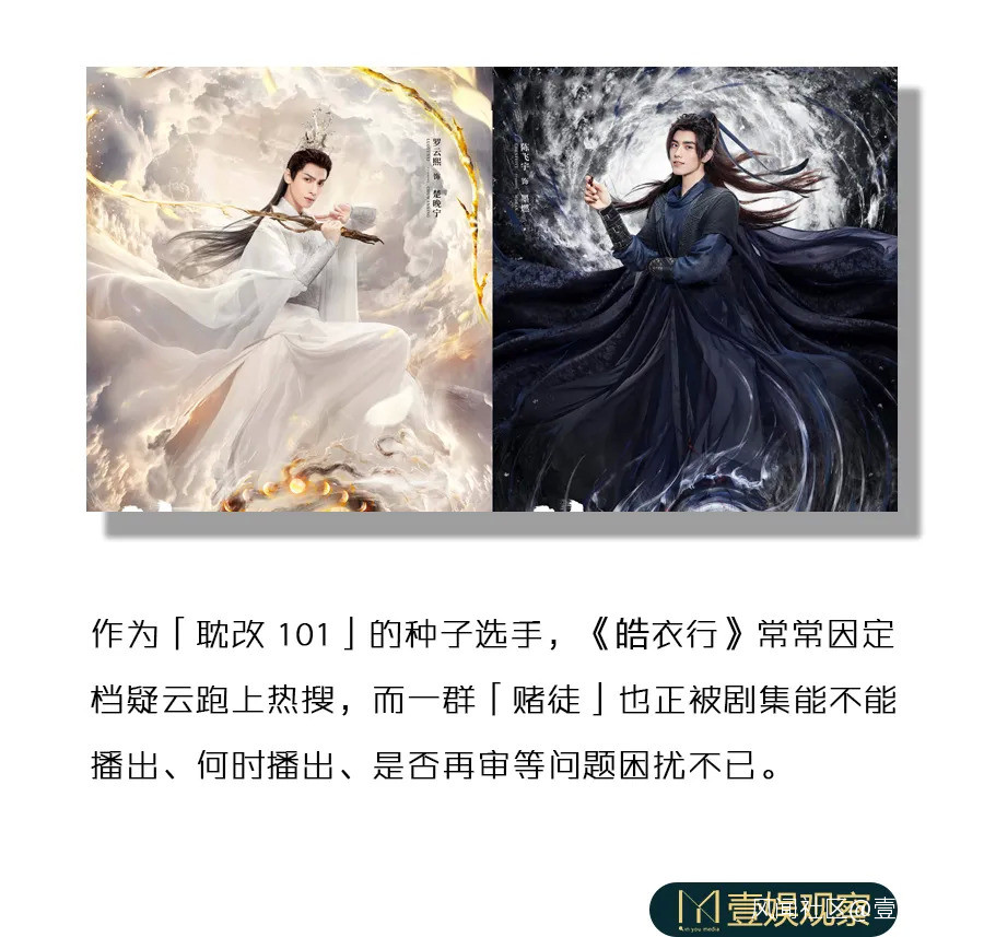 另外,播出平台騰訊視頻這邊,也存有《青簪行》《千古玦塵》《斛珠夫人》《鏡·雙城》等多部流量古偶劇,以及《殺破狼》《左肩有你》《張公案》等多部耽改劇,即使騰訊視頻對於《皓衣行》寄予厚望,但服務於會員的視頻網站首要原則是不能讓熱門內容出現空缺,誰能首先過審,誰就必然會搶佔平台先機,其餘只好繼續等待或延期。