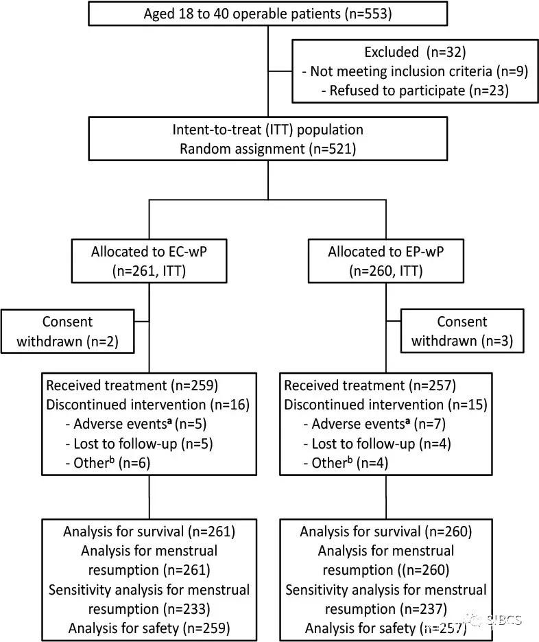 該多中心非盲隨機對照研究於2011年1月~2016年12月從全國8家醫院入組雌激素受體陽性HER2陰性乳腺癌術後年輕女性521例(年齡中位34歲、四分距31~38歲)按1∶1隨機分為兩組: