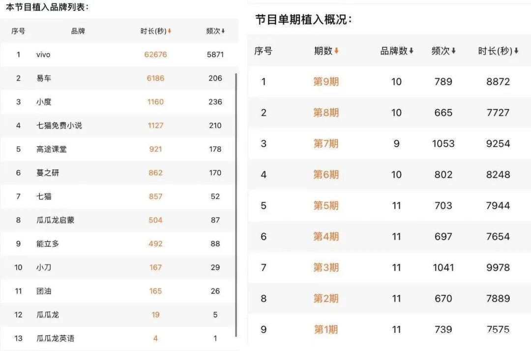 第六季《王牌對王牌》中一共擠進了包括VIVO、易車、小度、七貓免費小説在內的11個客户,植入形式從最簡單的口播、硬廣植入到環節定製,數量、頻次和時長都較上一季有明顯的增加。