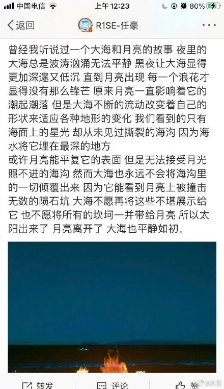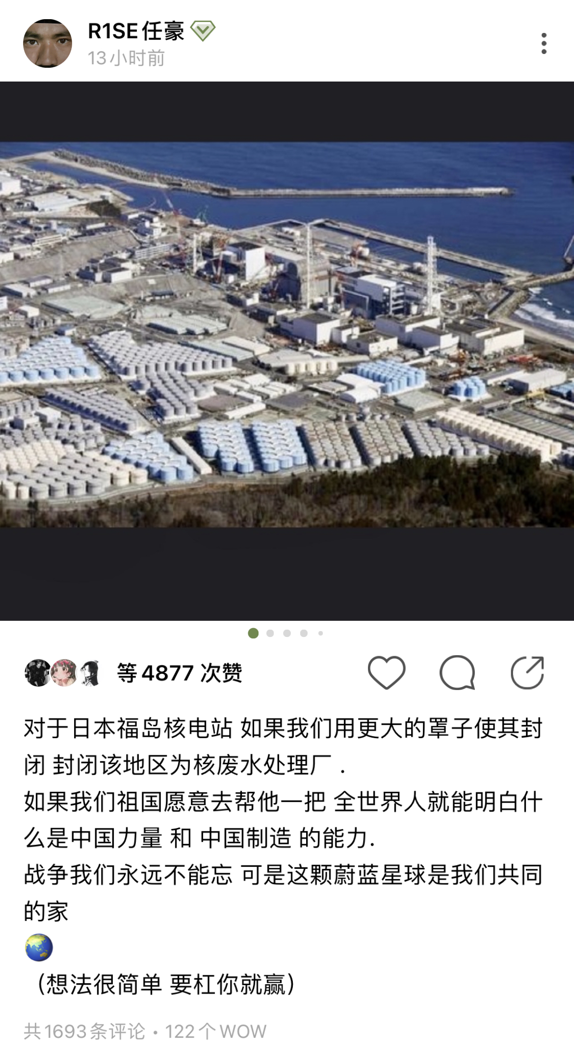4月14日17時59分,任豪在綠洲發佈動態並同步至微博,這位微博粉絲超過958萬的愛豆寫道:“對於日本福島核電站,如果我們用更大的罩子使其封閉,封閉該地區為核廢水處理廠。如果我們祖國願意去幫他一把,全世界人就能明白什麼是中國力量和中國製造的能力。戰爭我們永遠不能忘,可是這顆蔚藍星球是我們共同的家。”
