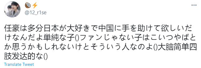 更有日本粉絲隔空感嘆:“任豪大概非常喜歡日本,只希望中國能夠助一臂之力吧。單純的孩子,不是粉絲的人也許覺得他很幼稚,大腦簡單四肢發達。”