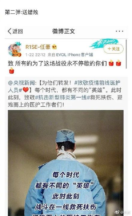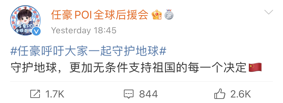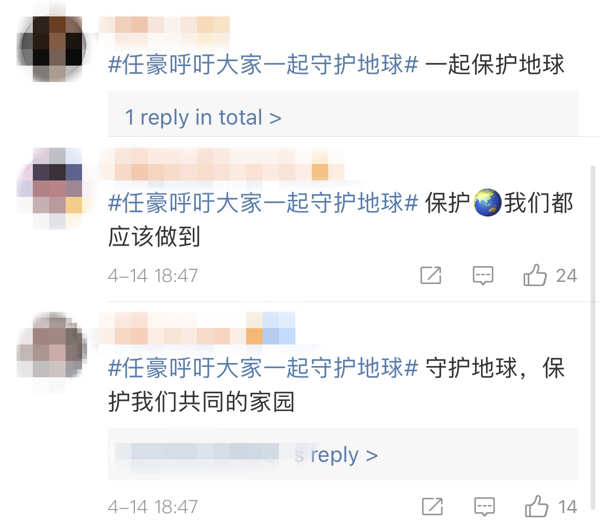 接着,任豪官方粉絲後援會@任豪POI全球後援會 更是開創性地將此不負責任的言論上升到“任豪呼籲大家一起守護地球”的高度,話題討論區,粉絲爭相跟隨偶像腳步。