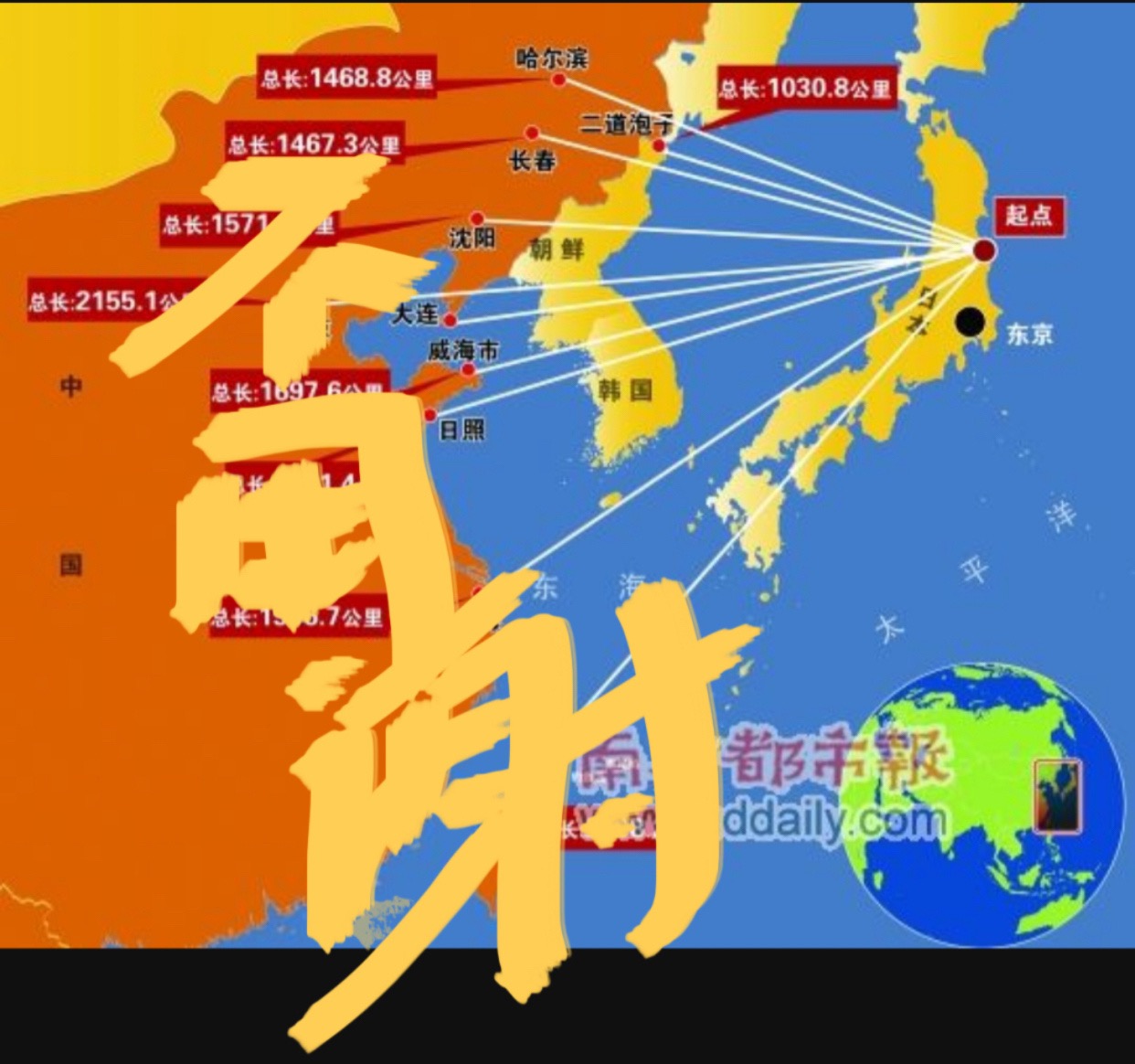 甚至“貼心”標出中國沿海主要城市與日本福島的距離,似乎在為“幫日本一把”的行動評估路線,更“智熄”的是,還寫上了“不用謝”三個大字。
