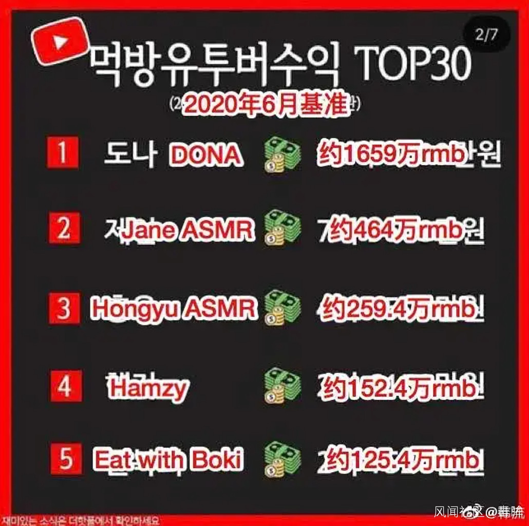 2020年6月,韓國吃播博主收入排行榜中,榜首的月收入高達1659萬人民幣,排名前五的博主月收入均超100萬。