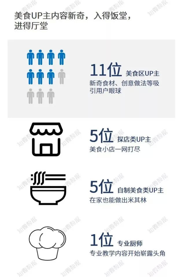 據知微數據統計,2020年B站百大up主中,美食類UP主有11位,僅次於遊戲(20)、知識(13)和生活類(12)。頭部美食類UP主越來越重視創意和視頻質量,選題多樣化,教學、探店、開箱等個性化內容越來越能脱穎而出。