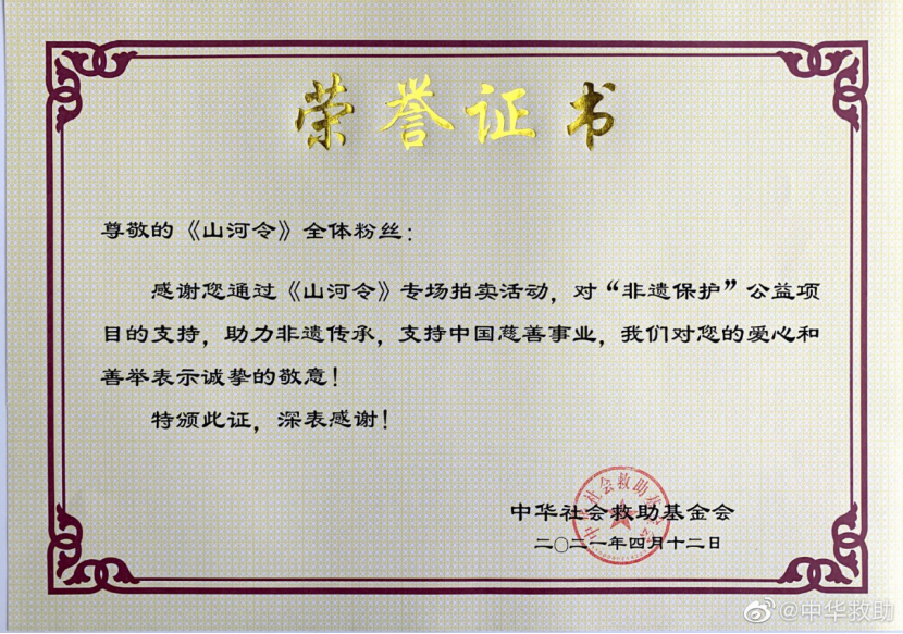 前幾天,“中華救助”官微發佈了一條關於《山河令》專場拍賣活動榮譽證書的微博。證書的開頭寫到“尊敬的《山河令》全體粉絲“,文案結尾@優酷(官方微博),隨即優酷在評論區@全體山人,快來領取你們的公益證書。
