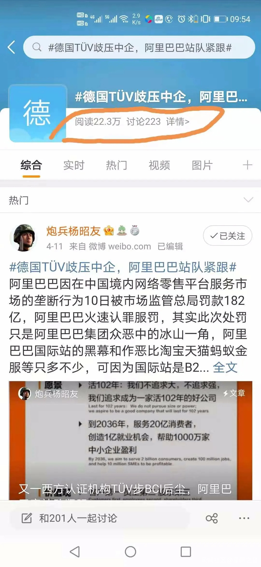 自從網絡爆出#德國TÜV歧壓中企,阿里巴巴站隊緊跟#的話題之後,有網友大概也是因不滿中外資本的勾結,出於義憤,將微博文章在自己的公眾號“民之力”上轉載,這篇《又一西方認證機構TÜV步BCI後塵,阿里巴巴竟站隊緊跟》 的公眾號文章閲讀量不過區區數千,微博話題也僅有22萬多的閲讀量,不温不火,遠遠還夠不上一個網絡熱點事件。