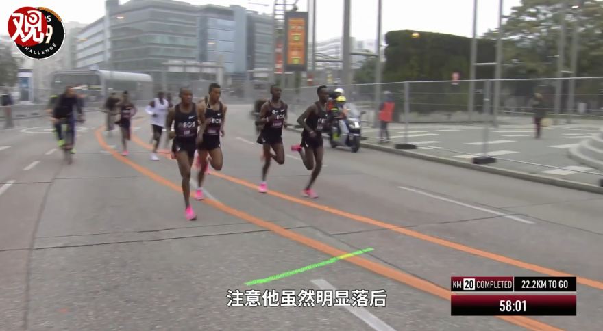這是基普喬格跑到差不多半程的時候。注意啊,他雖然明顯落後,但畫面中的黑衣人,其實都是隊友。