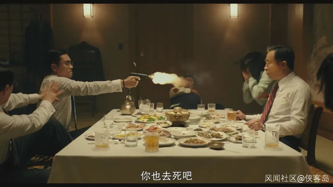 朴正熙等人紛紛落座,喝酒談天,兩名藝妓,一左一右,坐在樸大統領身邊。二女黑髮披肩,面容較好,濃妝淡抹,穿着半透明的長裙,格外妖嬈。