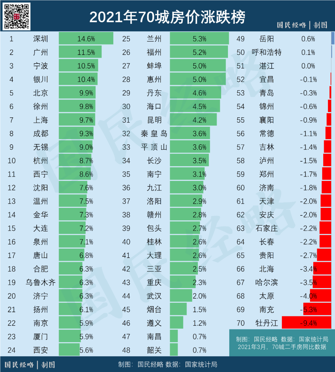 這是國家統計局發佈的2021年3月70個大中城市二手房價同比走勢: