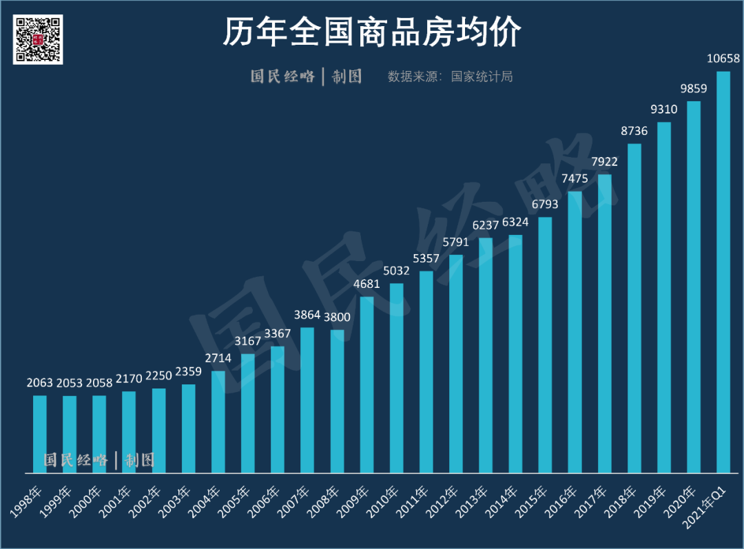根據國家統計局發佈的最新數據,2021年一季度,全國商品房銷售均價為10658元/平,而去年全年均價為9859元/平。