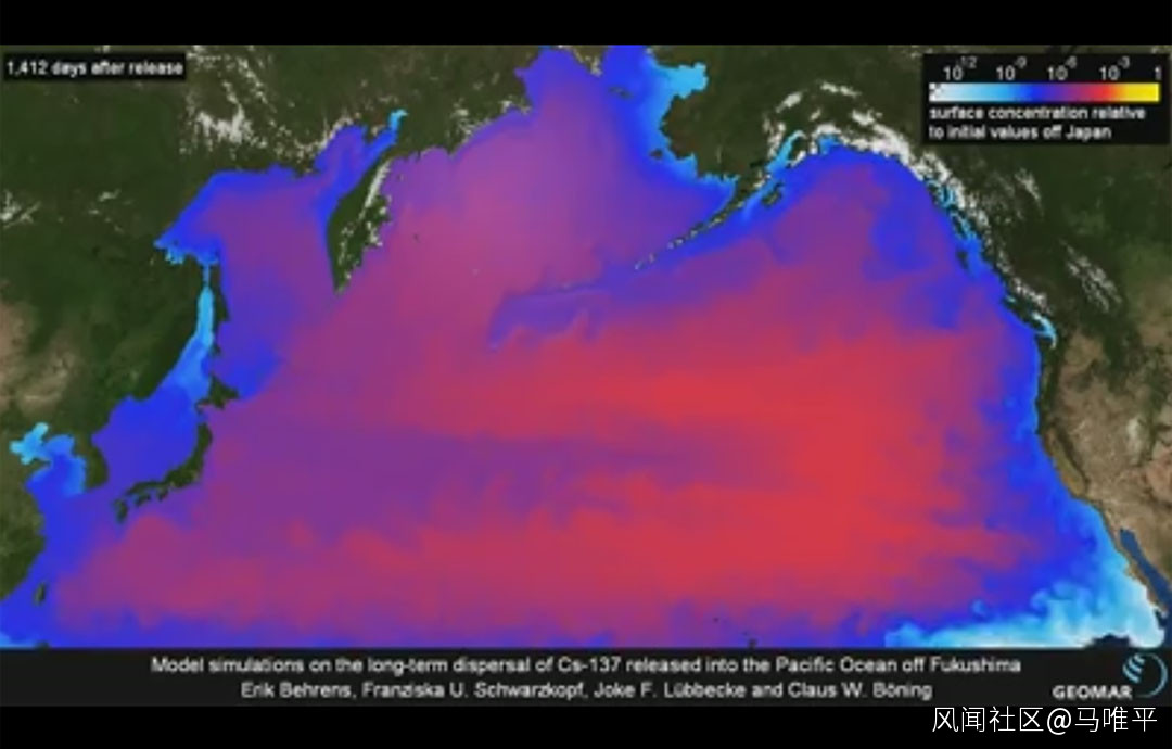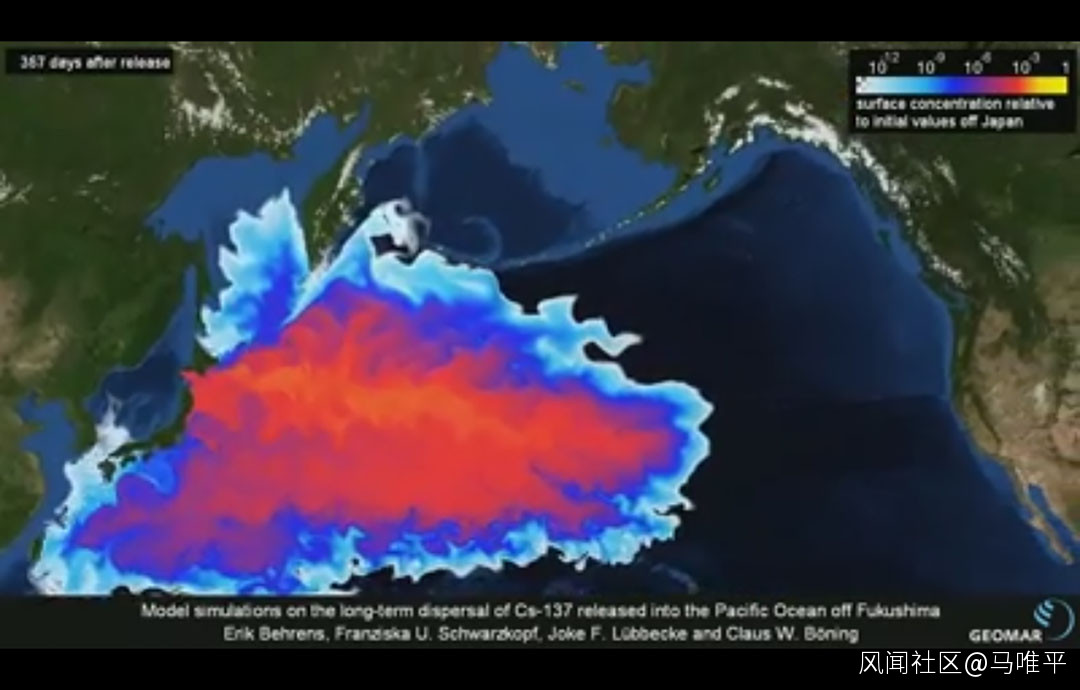 這篇文章主要談的是俄羅斯遠東聯邦大學和俄羅斯科學院遠東分院化學研究所,發明了一種新的和被賦予專利的方法,即如何提取海洋中的銫-137和清除其它放射性元素。它舉出了3張不同時間後日本福島核毒水在太平洋擴散的模擬圖,如下: