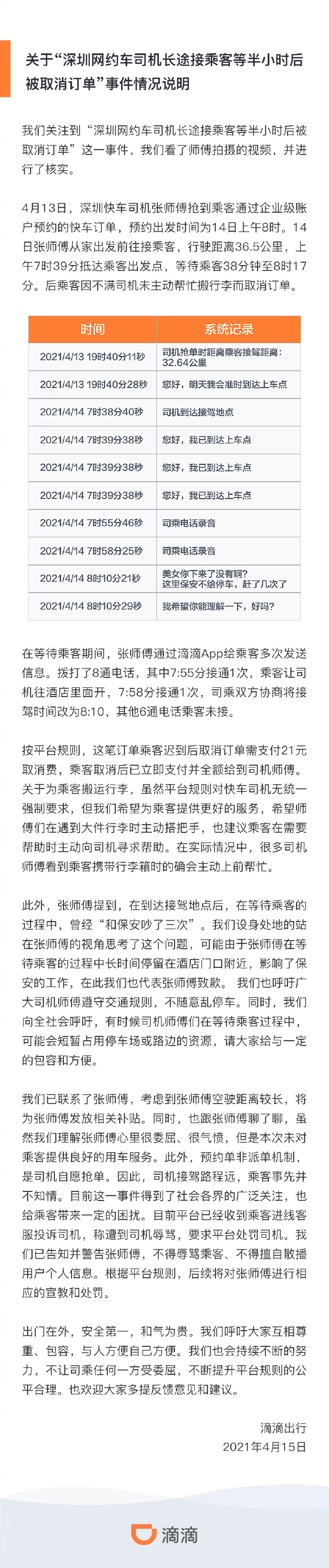 值得注意的是,15日晚滴滴出行平台官博發文回應了此事。在這份關於“深圳網約車司機長途接乘客等半小時後被取消訂單”事件的情況説明中,滴滴核實、公開了事件經過,也公佈了平台處理結果。