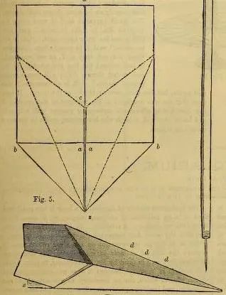根據書中記載,這種玩具“由一張長方形的紙片製做而成”“能在空中劃出優美的曲線” alt=“500” /> 再往後到了1873年,位於倫敦的Cassell 公司在其出版的《The Popular Recreator》中用插圖明確了紙飛鏢的做法: