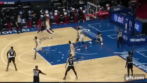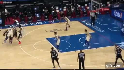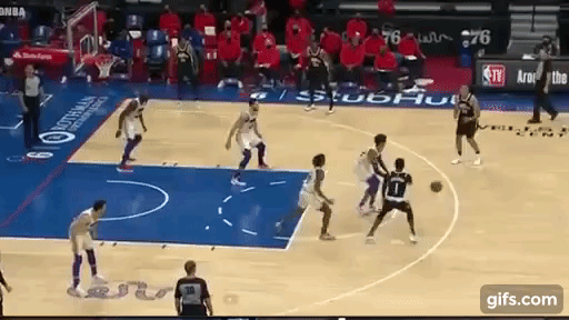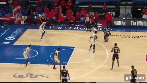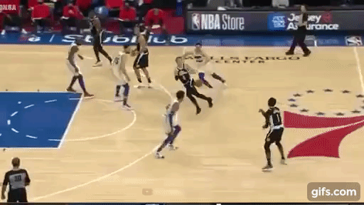 比賽最後一回合快船103比106落後,邊線發球,西蒙斯貼着喬治,讓已經得到37分的喬治接不到球。