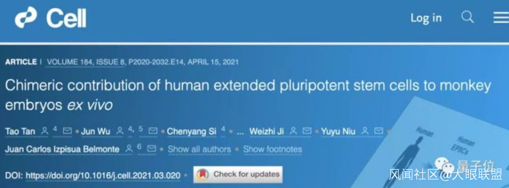 《Chimeric contribution of human extended pluripotent stem cells to monkey embryos ex vivo(人類擴展多能幹細胞對猴胚胎體內的嵌合作用)》。