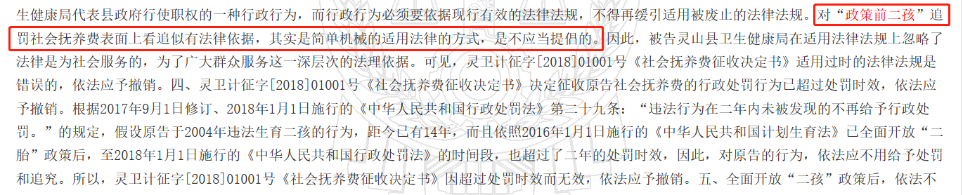 在另一起“政策前二孩”被徵撫養費案例中,廣西壯族自治區靈山縣人民法院在2019年的一審行政判決書中寫道,“行政行為必須要依據現行有效的法律法規,不得再緩引適用被廢止的法律法規。對‘政策前二孩’追罰社會撫養費表面上看似有法律依據,其實是簡單機械的適用法律的方式,是不應當提倡的”。