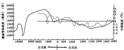 圖中實曲線表示的是挪威雪線高度,作為温度變化的參考,0℃則為作者成文年代時的平均温度(作為基準)。