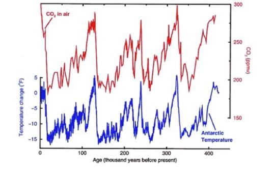 俄羅斯南極東方站採集的遠古冰芯數據則更加直觀地表明温度變化規律。
