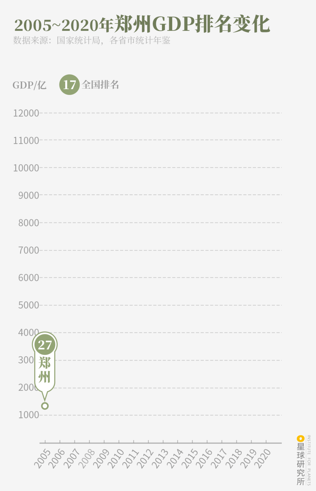 (2005-2020年鄭州GDP排名變化,製圖@羅梓涵/星球研究所)
