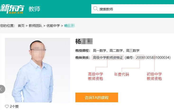 下面的李姓老師,編號第十位顯示是“3”,即初級中學教師資格,但是教授課程卻為高一至高三英語課程。(見下圖)