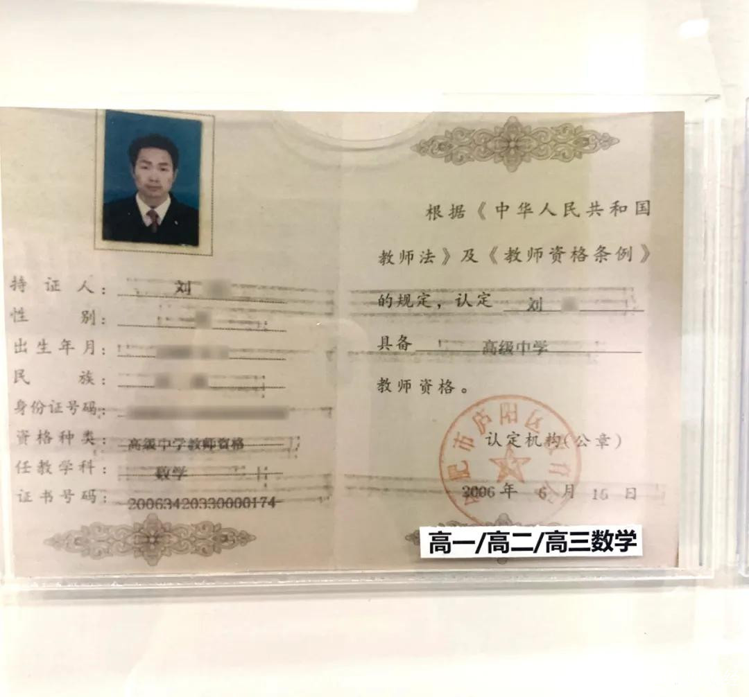 通過上圖不難發現,這位劉姓老師的資格證編號第十位是“3”,代表他所取得的是初級中學教師資格。但在教師資質處卻堂而皇之的標註着“高級中學教師資格證”字樣,且教授高中課程。