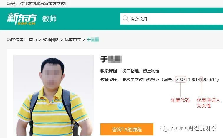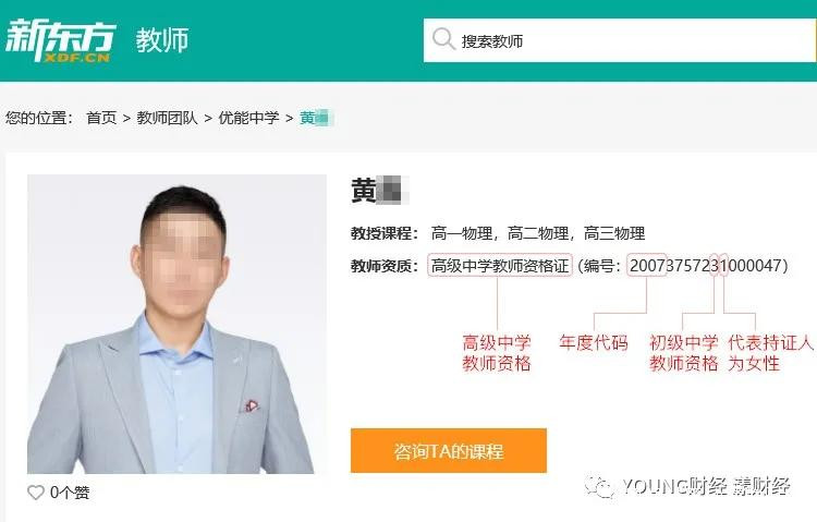 登錄新東方官網,在優能中學宣傳板塊中,YOUNG財經在教師團隊一欄搜到了王女士口中的這位金簰教師。發現這位收費頗高的新東方金簰教師,連教師資格證都是假的。