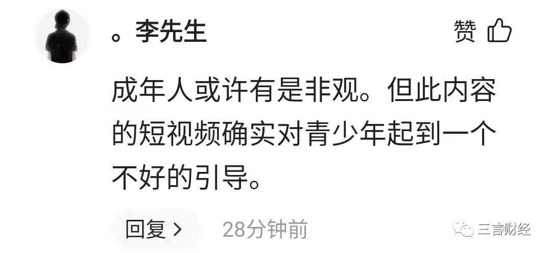 但也有網友指出,成年人心智比較成熟看看倒無所謂,但是此類視頻很容易對青少年產生錯誤引導。