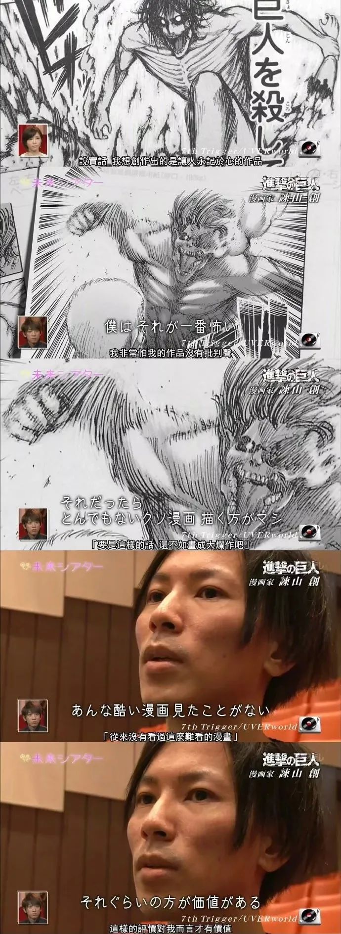 有讀者甚至扒出了諫山創此前的採訪:“説實話我想創作出讓人永記於心的作品,我非常怕我的作品沒有批評聲,要是這樣的話還不如畫成大爛作吧。從來沒有看到過這麼難看的漫畫,這樣的評價對我而言才有價值。”