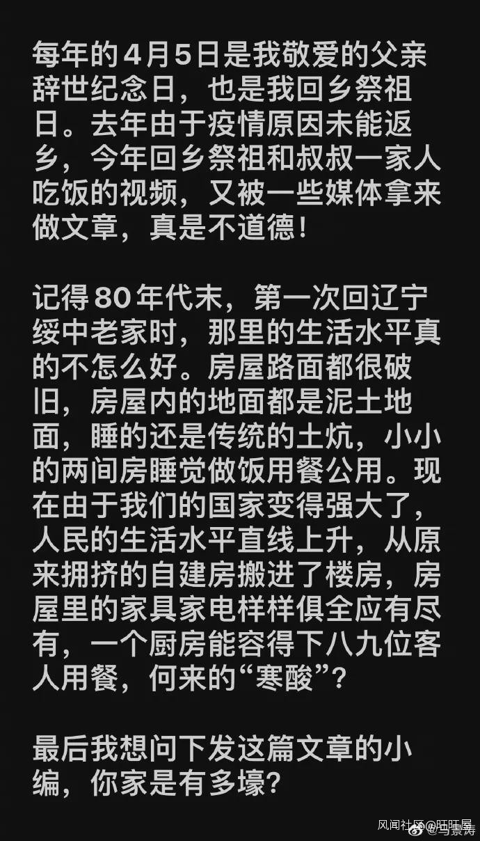 不過這組畫面引發了一些爭議,不少人嘲諷他家中破爛擁擠,電器老舊寒酸,境況堪憂。惹得馬景濤發文回應: