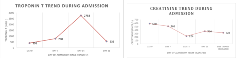 圖:患者入院期間肌鈣蛋白T變化(左)和肌酐變化(右)/BMJ case report