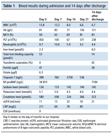 患者在院時及出院14天后血液指標一覽/BMJ case report
