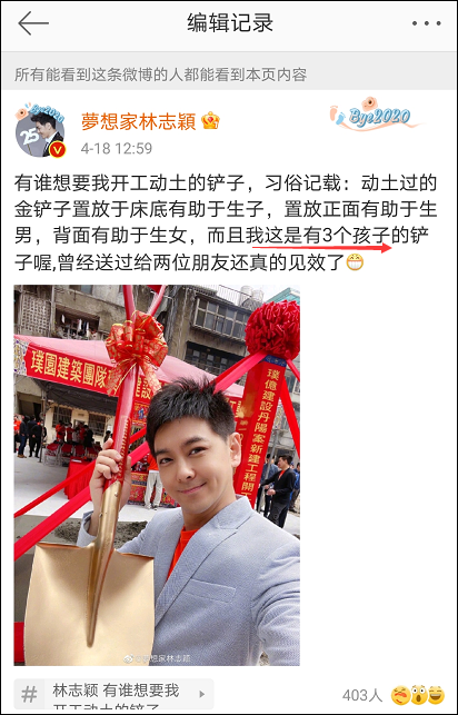 對此,林志穎先是公開回復,稱這只是一個地域習俗,生男生女都一樣,請網友不要過多解讀。之後,他又重新編輯了原博文,將“我這是有3個兒子的鏟子”修改為“我這是有3個孩子的鏟子”。