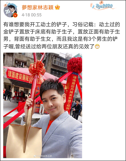 今日凌晨,林志穎在微博上曬出了一張他在某公司工程開工儀式上手舉金鏟子的自拍照,並配文稱“有誰想要我開工動土的鏟子,習俗記載:動土過的金鏟子置放於牀底有助於生子,置放正面有助於生男,背面有助於生女。”