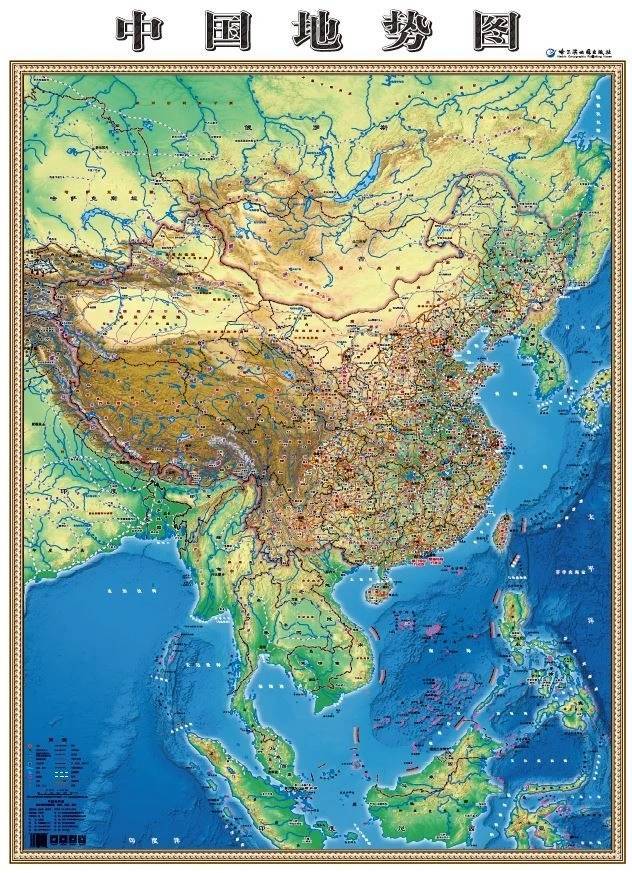 《中國地勢圖》利用全球地形數據和地貌暈渲技術完整地再現我國及周邊複雜的海陸地貌形態,直觀反映了我國地勢西高東地,呈三級階梯狀分佈的特徵。