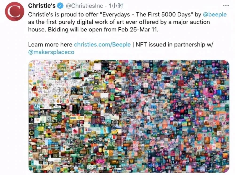 無獨有偶,這10秒短視頻作者Beeple的另一藝術作品——“Everydays:TheFirst 5000Days”在知名藝術品拍賣平台佳士得上以6700萬美元的價格成交。