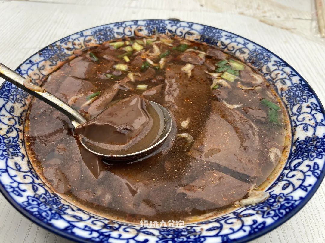 豬血是鮮豬血,在著名的電信豬血湯的店門口,我看到的場景簡直如同“兇殺現場”一般,門口就擺着鮮豬血,鍋子裏也漂着豬血湯,老闆娘手腕一抖、勺子一打,滿滿一碗豬血。