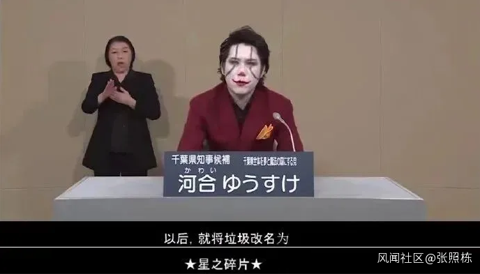 把自己打扮成小丑模樣,穿上一身紅色西裝,40歲的日本千葉縣知事候選人河合悠祐一本正經地坐在鏡頭前,宣講着自己競選的政策舉措。