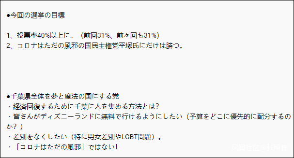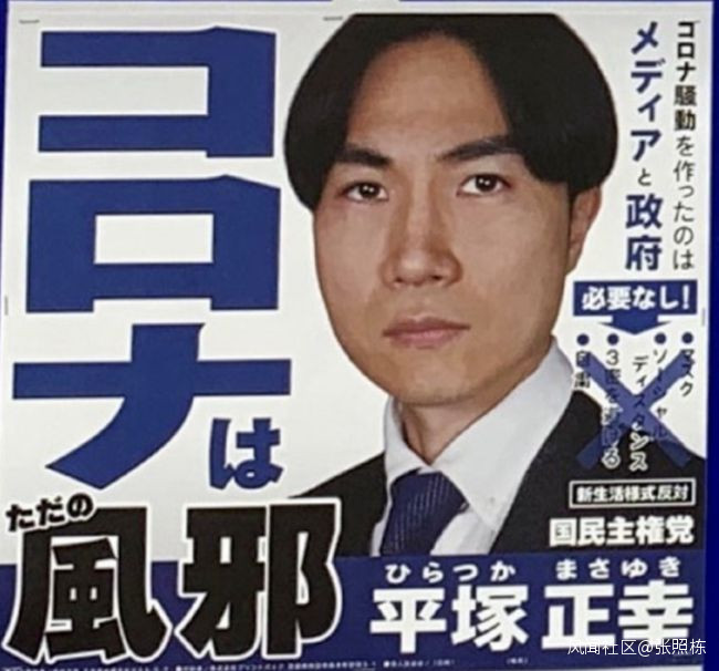 而在今年的千葉縣知事競選中,平塚正幸將自己的口號升級了,除了去年的口號外,他還加上了“不要接種疫苗”,聲稱“打疫苗會讓健康的人生病。”
