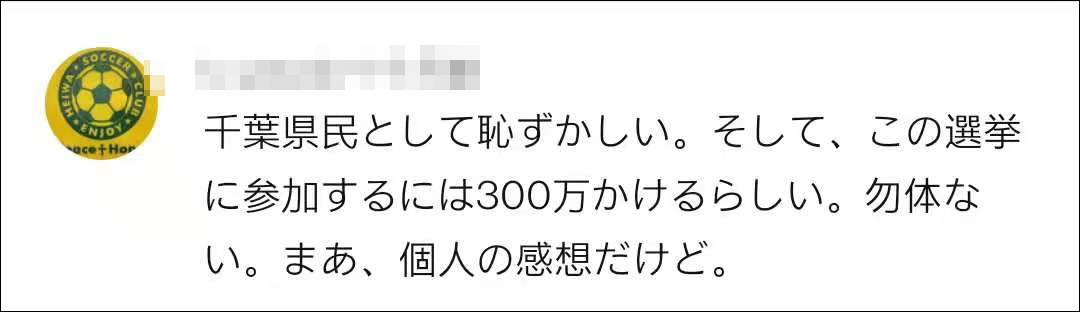 也有人表示反感:“作為千葉縣人感到羞恥。而且,據説要參加這次選舉需要花費300萬日元,真是太可惜了。”